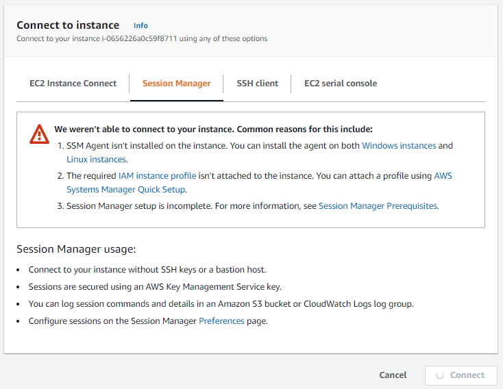 그 중 Session Manager를 클릭하면 아래와 같이 Connect 버튼이 비활성화되어 있는 것을 볼 수 있습니다.