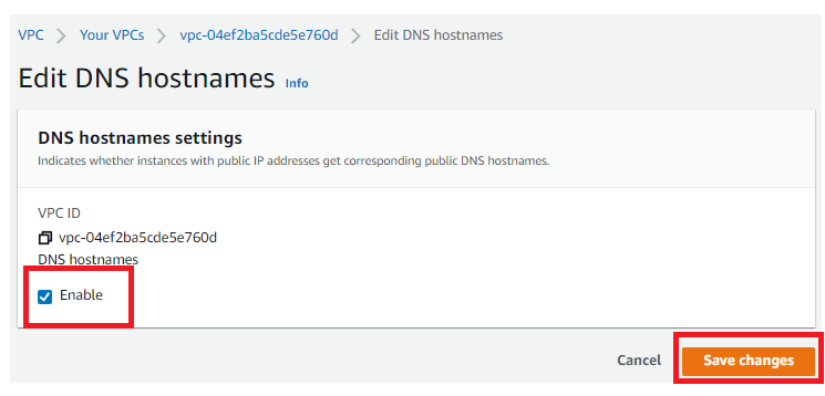 사용 중인 VPC를 클릭한 후 [Edit DNS hostnames]를 클릭해줍니다.