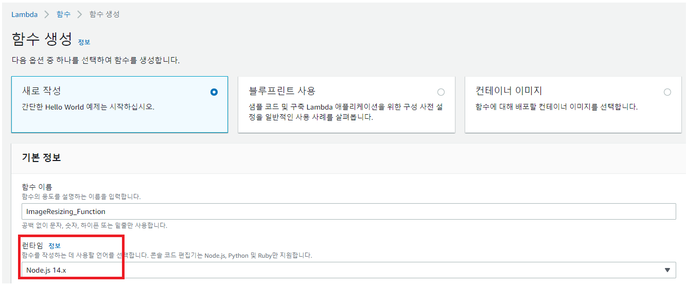 [런타임]에서 Node.js 14.x 버전을 선택합니다.
