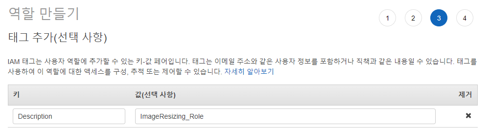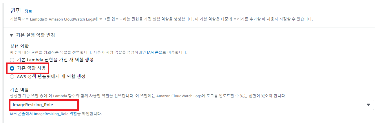 아래 [권한] 부분에서 [기존 역할 사용] 부분에 앞서 생성했던 역할을 부여해줍니다.