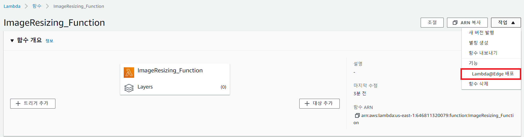 우측의 [작업]-[Lambda@Edge 배포]를 클릭합니다.