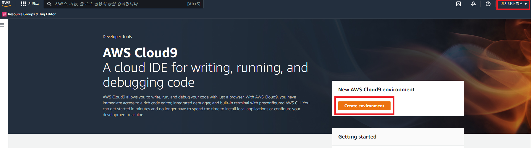 먼저 버지니아 북부 리전으로 이동 후 [Cloud9]-[Create Environment]를 클릭합니다.