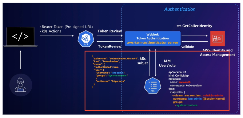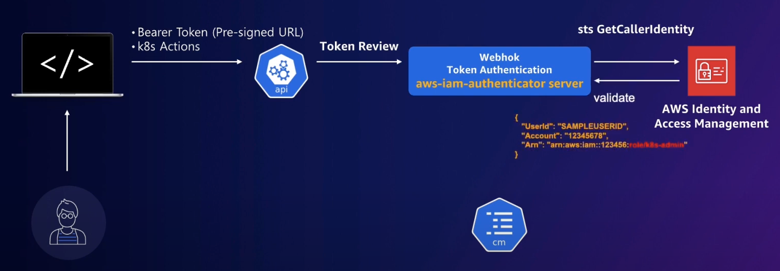 aws-iam-authenticator server는 Token Authentication Webhook 호출 -> sts get-caller-identity 호출 과정을 통해