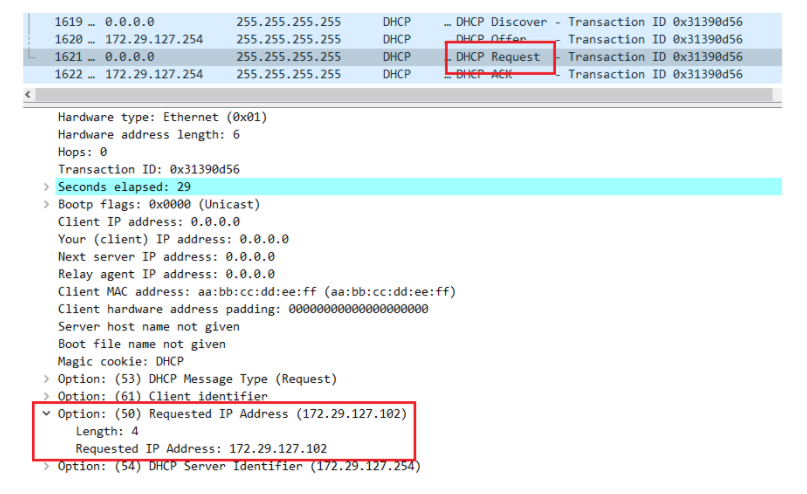 - 현재 IP는 0.0.0.0이며 Client MAC주소만 가지고 있는 상태
