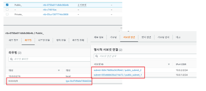 - 퍼블릭 서브넷은 외부와 통신하기 위해 라우팅 테이블에 Internet Gateway를 추가한다.
