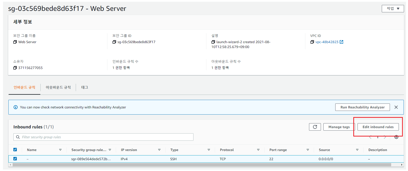 - 보안 그룹을 클릭하여 [Edit inbound rules]를 클릭한다.