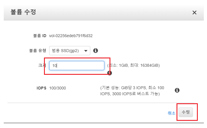 - [볼륨] 탭에서 [볼륨 수정]을 클릭하여 8GB -> 10GB로 수정한다.