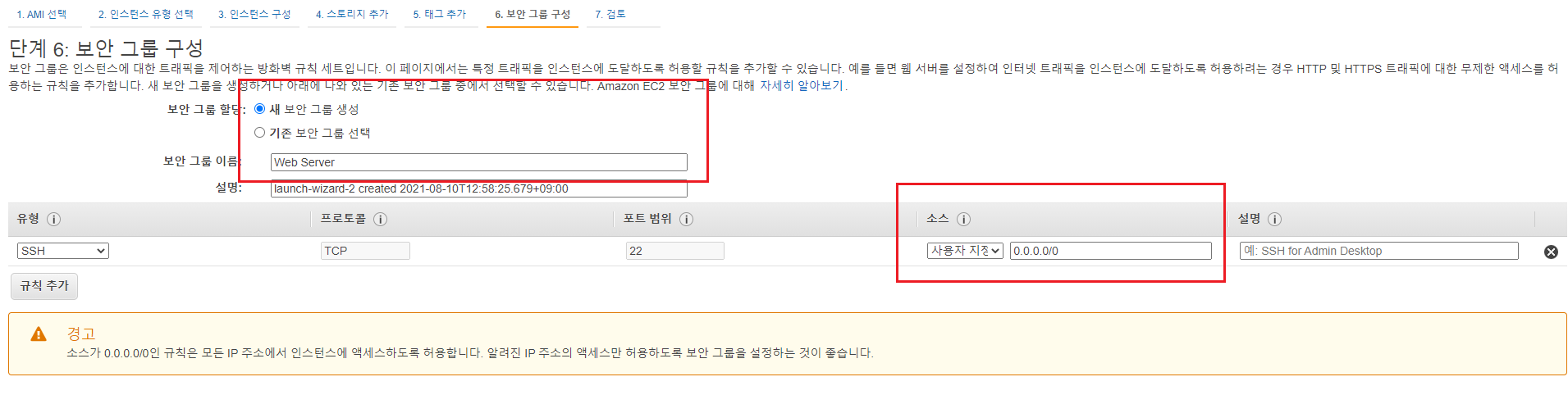 - 보안그룹 또한 새로 생성하지 않고 아까 만들어두었던 Web Server 보안그룹을 선택한다.