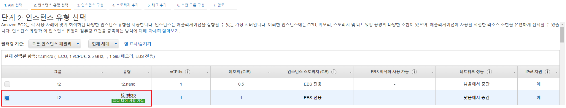 - 인스턴스 유형 역시 프리티어에 제공되는 t2.micro를 선택한다.
