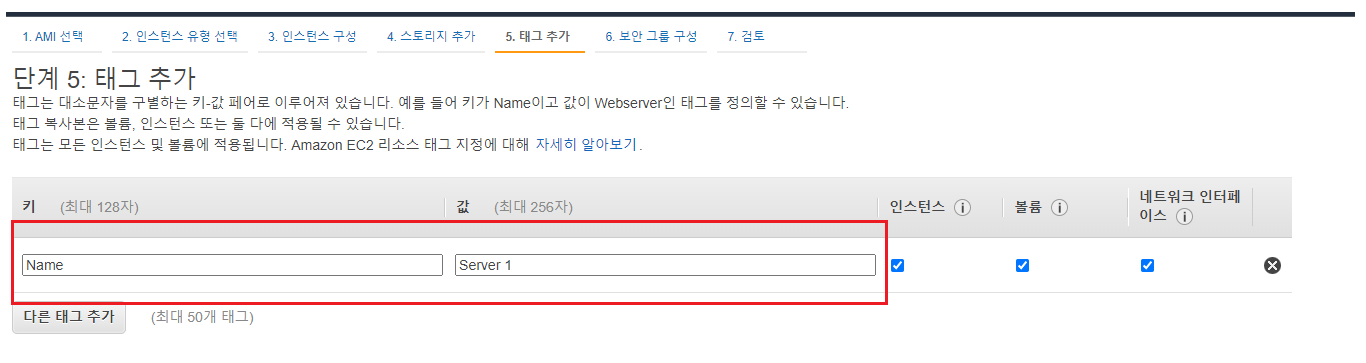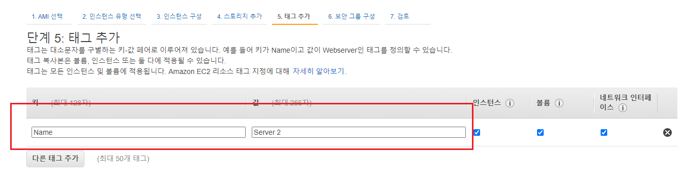 - [태그]에서 인스턴스 구분을 위해 Server 2 태그를 추가한다.