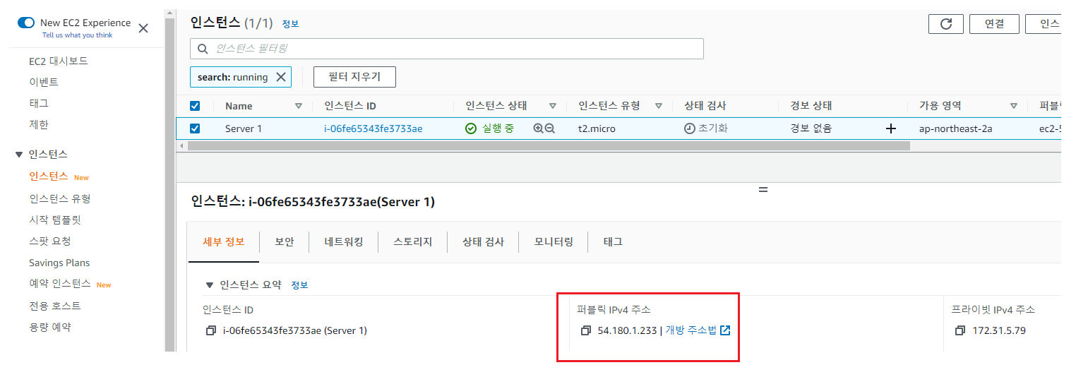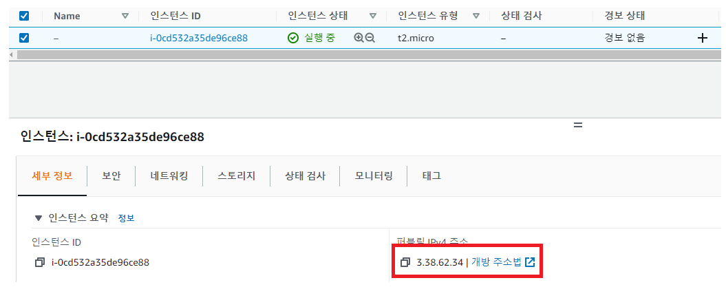 - 인스턴스 대시보드에서 방금 만든 인스턴스가 실행 중인 것을 확인할 수 있고, 상세 정보를 통해 Public IP 주소를 확인한다.