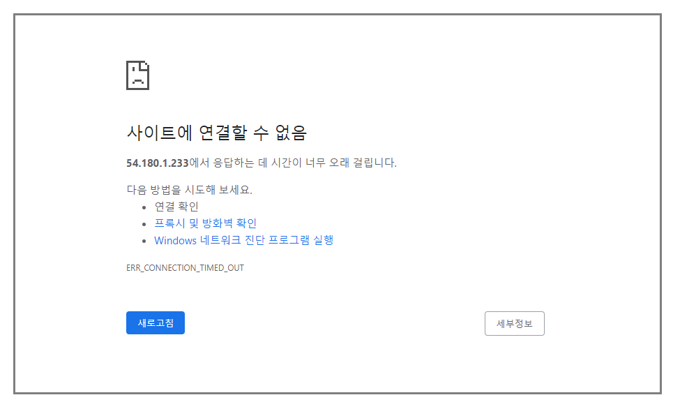 - 이제 퍼블릭 ip를 통해 웹 서버에 접속하려 하면 아래와 같이 연결할 수 없음이 표시된다.