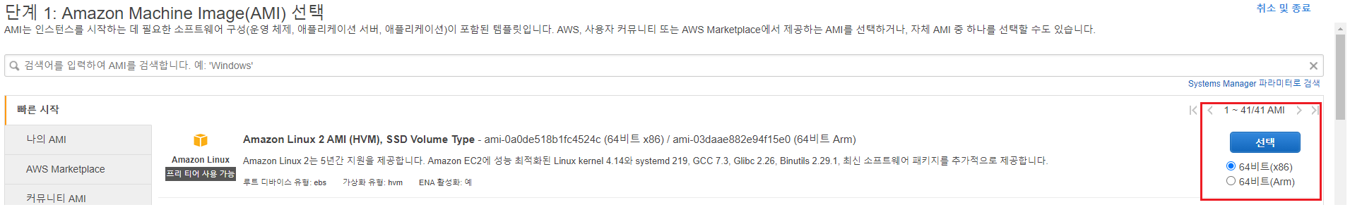 - AWS에서 프리티어에 기본적으로 제공해주는 리눅스 이미지를 선택한다.