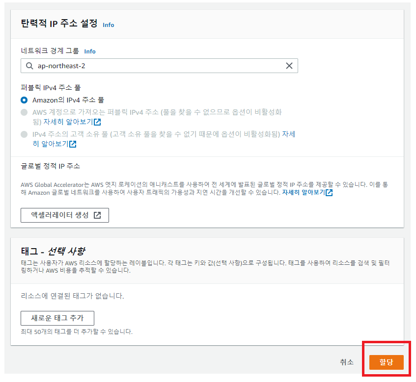 - [할당]을 클릭하면 아래와 같이 공인 IP 주소가 할당된다.