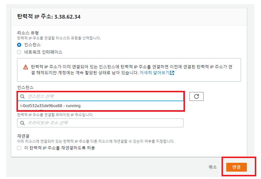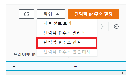 - 이 EIP를 EC2 인스턴스에 할당해야 하기 때문에 [탄력적 IP 주소 연결]을 클릭한다.