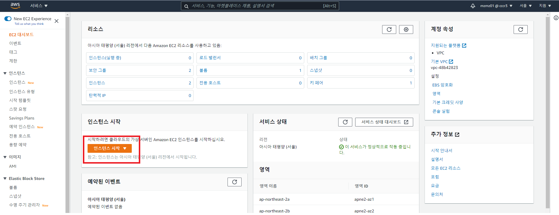 - AWS 콘솔에서 [인스턴스 시작]을 통해 새 인스턴스를 생성한다.