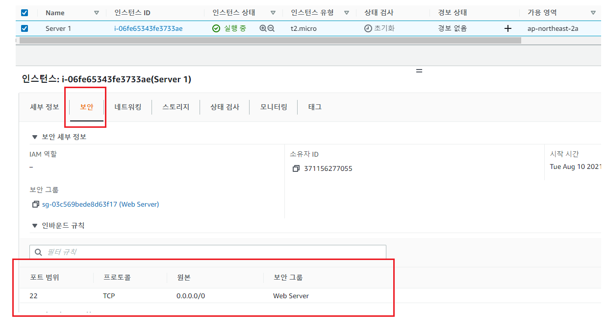 - 다시 인스턴스 세부정보에서 [보안] 탭을 클릭하여 [인바운드 규칙]을 살펴보자.