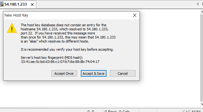 - 처음 접속할 땐 key 등록을 위해 아래와 같이 알림창이 뜨고 Accept & Save를 누른다.