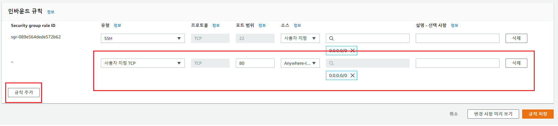 - [규칙 추가]를 통해 80번 포트를 추가해준다.
