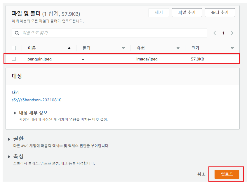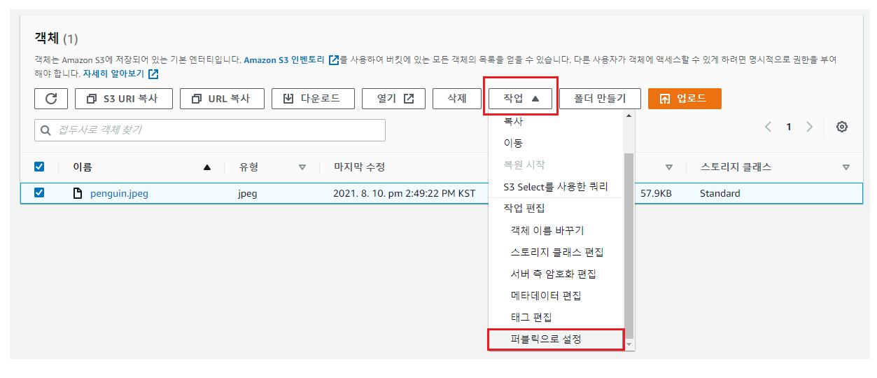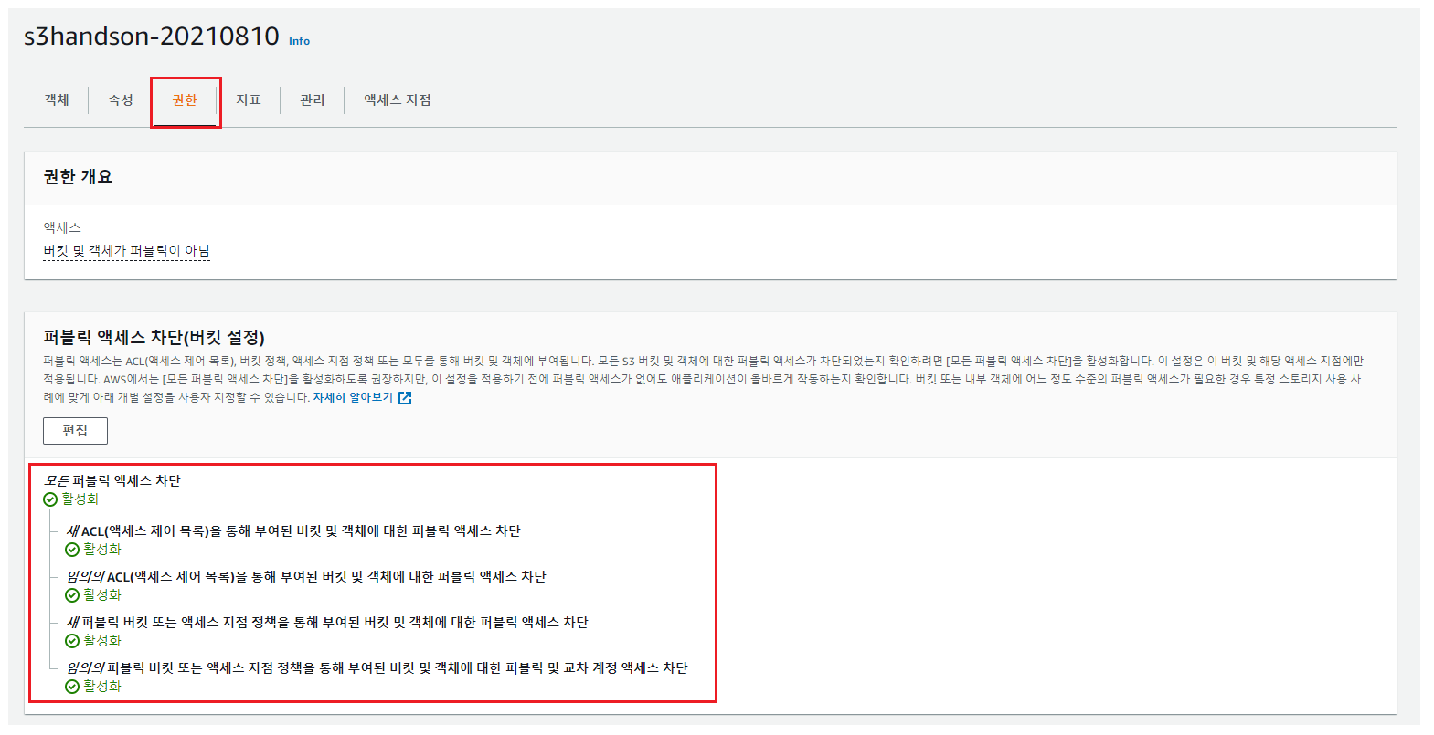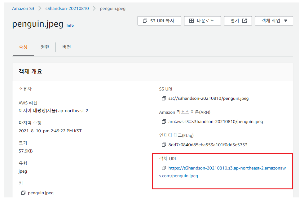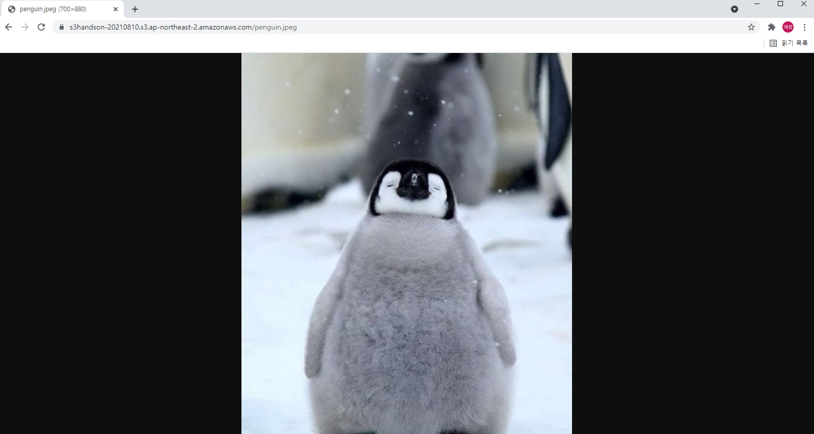 - penguin.jpeg란 파일은 현재 s3handson-20210810라는 버킷에 들어있기 때문에 버킷의 권한을 수정해주어야 한다.
