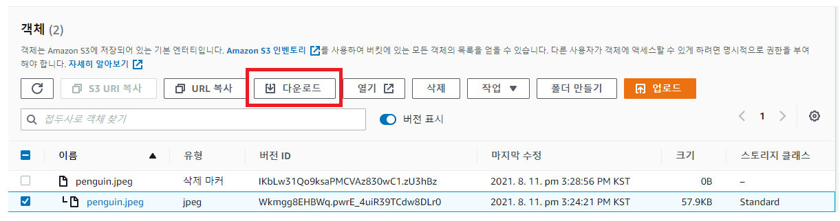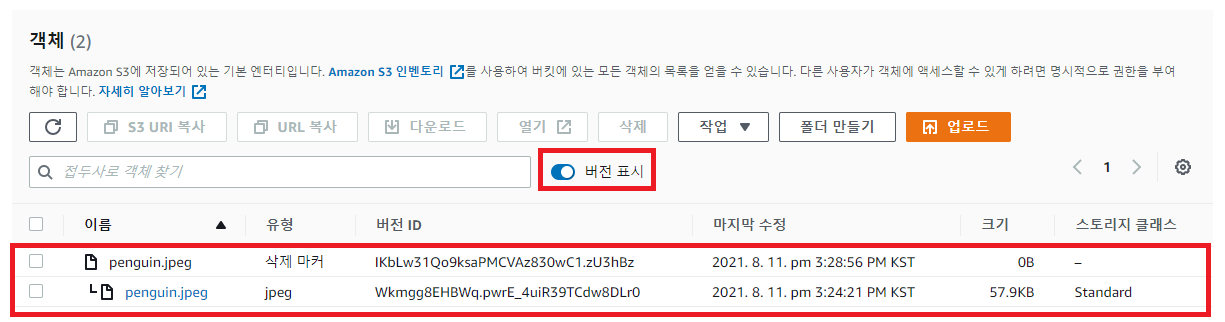 버저닝이 활성화돼지 않은 경우 그 객체는 바로 삭제되니 주의 필요.