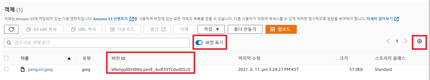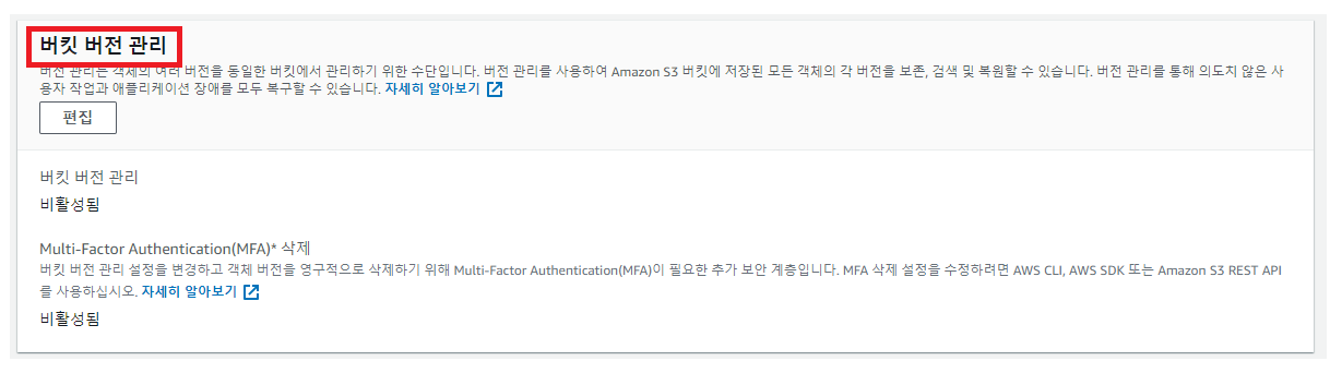 - 버킷을 생성하는 경우 Default로 버저닝이 비활성화 돼있다.