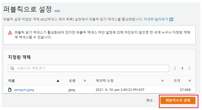 - 업로드했던 파일을 클릭하여 [퍼블릭으로 설정]을 클릭한다.