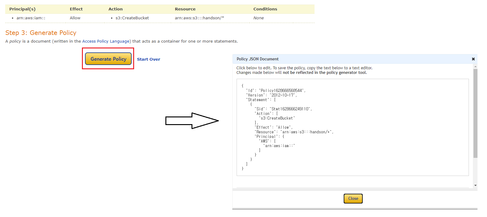 - [Generate Policy]를 클릭하면 Json 형식의 정책을 생성해주는데, 이를 복사해서 붙여넣기 하면 된다.