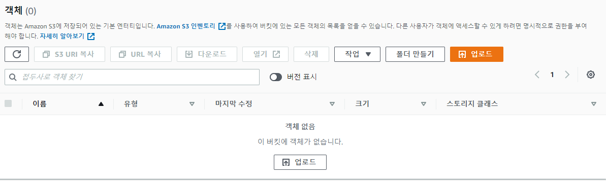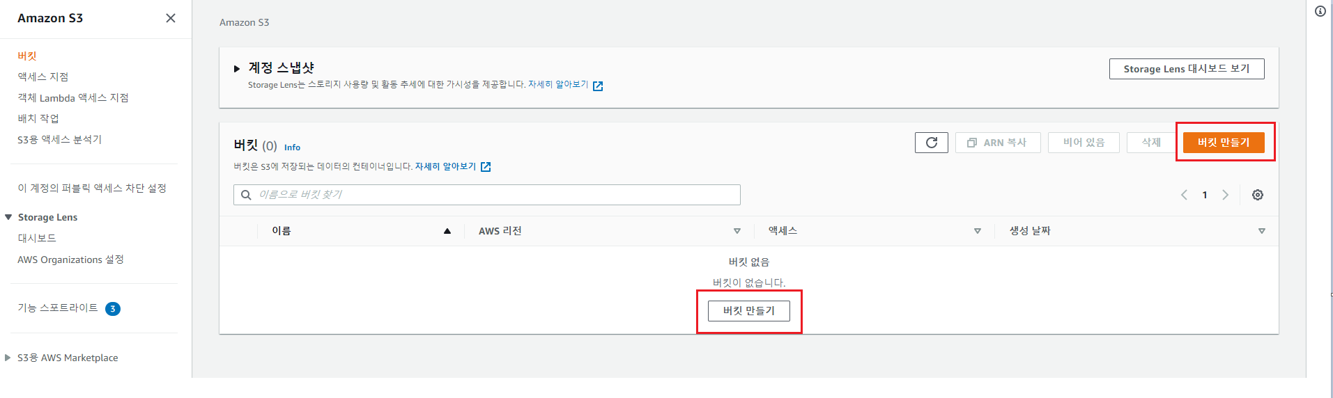 - [버킷 만들기]를 통해 새로운 S3 버킷을 생성한다.