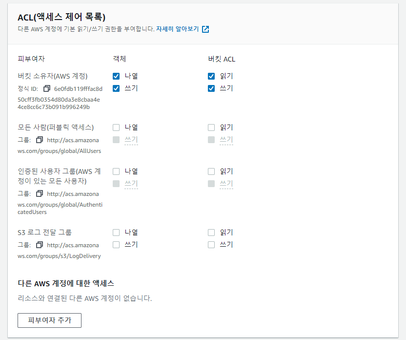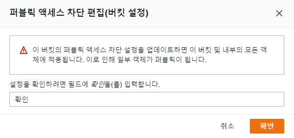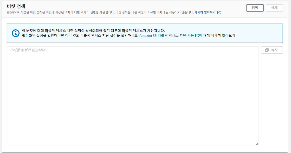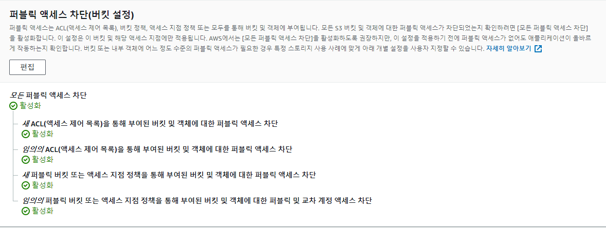 처음 버킷을 생성할 때 권한 부분을 변경한 것이 없기 때문에 기본적으로 "모든 퍼블릭 액세스 차단"이 설정돼있어