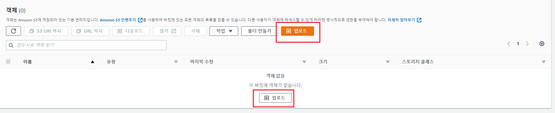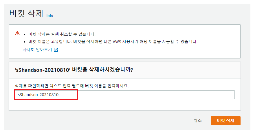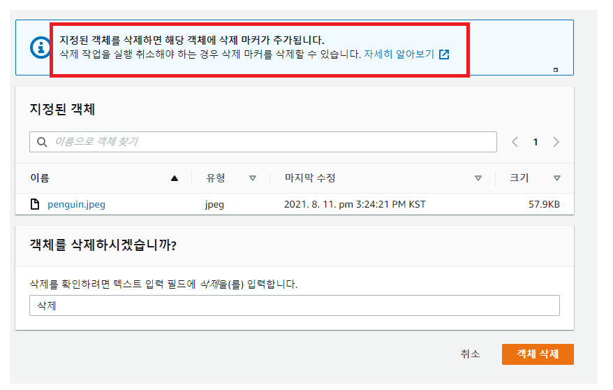 - 버킷에 객체가 있으면 삭제가 되지 않으니, 업로드했던 파일을 모두 삭제한 후에 버킷 삭제를 진행한다.