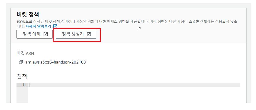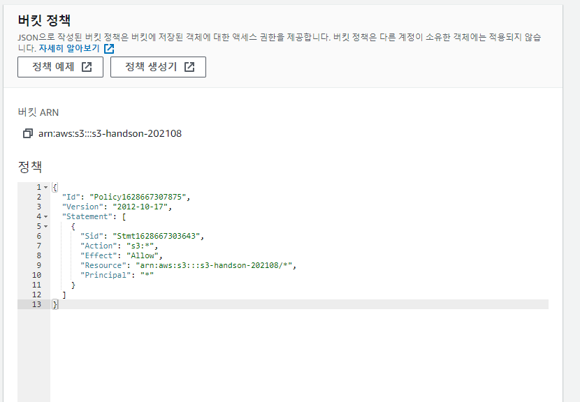 - Json 형식의 템플릿을 아래 버킷 정책에 넣어주면 정책이 생성된다.