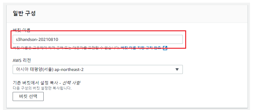 이름을 설정한 후 [버킷 만들기]를 통해 버킷을 생성한다.