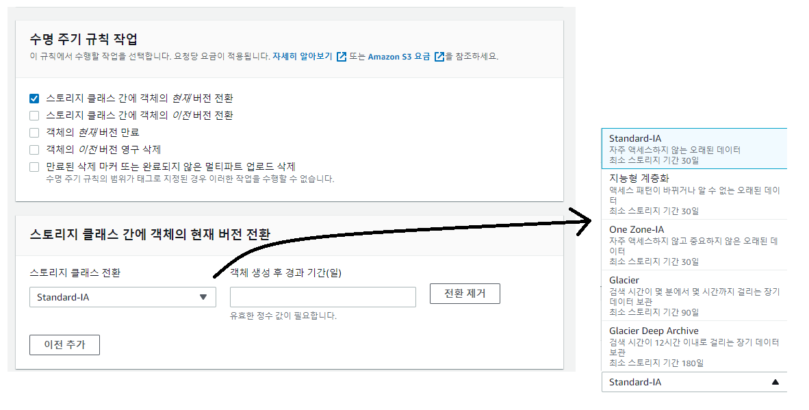 - 원하는 스토리지 클래스 전환을 선택하고 객체 생성 후 지정된 경과 기간이 지나면