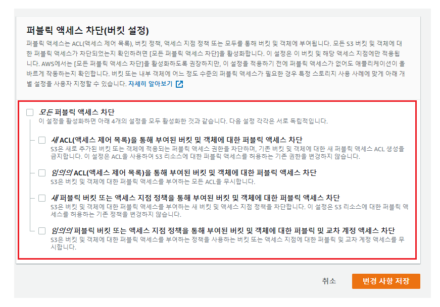 "모든 퍼블릭 액세스 차단" 옵션이 활성화 돼있다면, ACL에서 퍼블릭 액세스에 대한 권한을 변경하여도