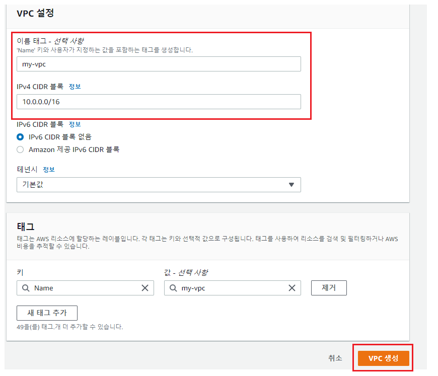- VPC 이름과 사용할 IP 대역을 설정한 후 [VPC 생성]을 클릭한다.
