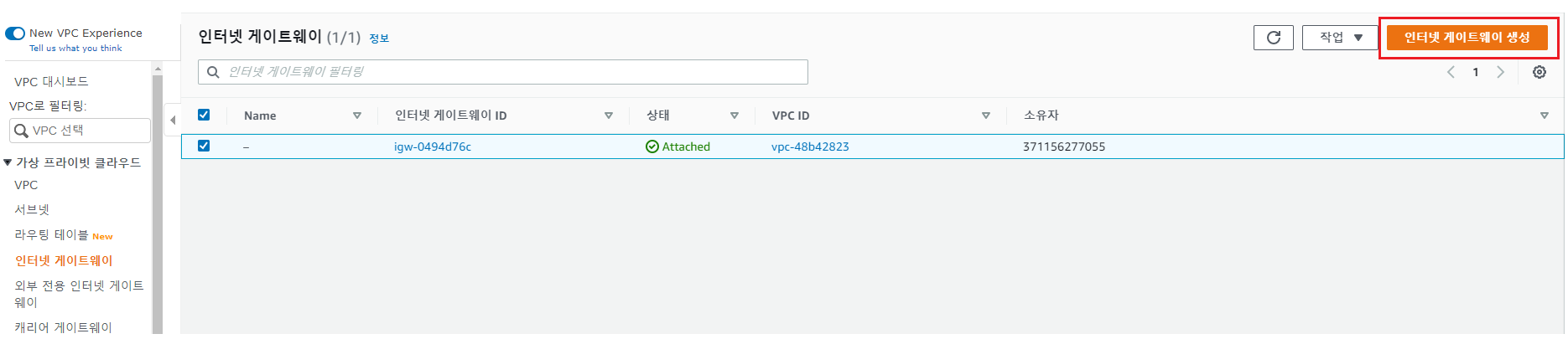 - [인터넷 게이트웨이 생성]을 클릭한다.