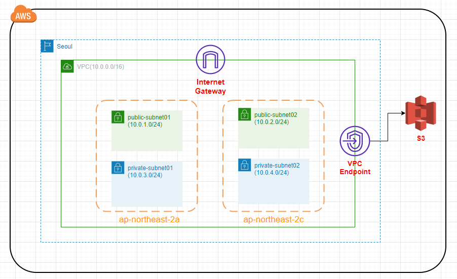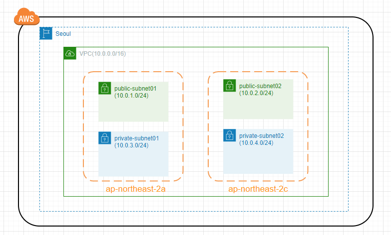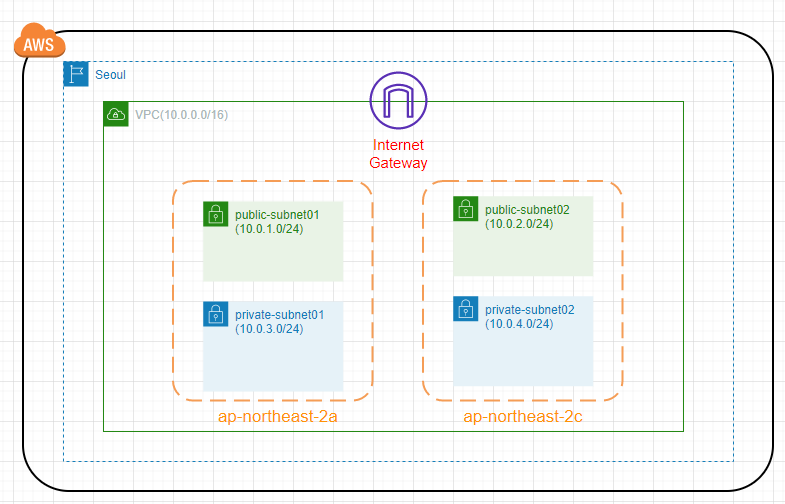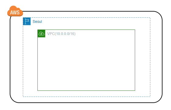 - 서울 리전에 vpc를 생성했으므로 현재 아키텍처는 아래와 같다.