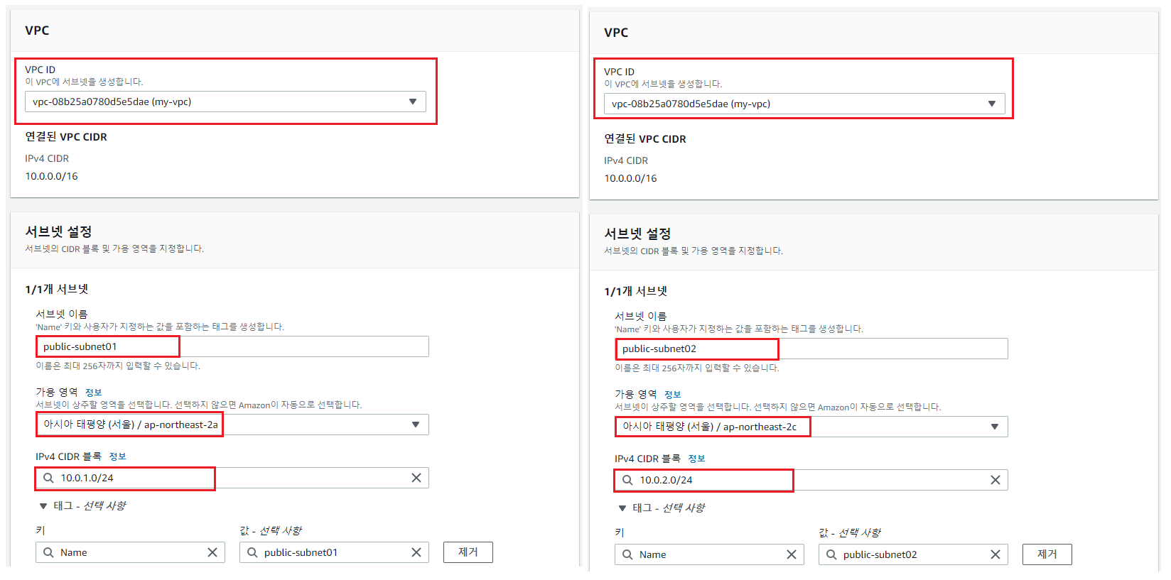 - 퍼블릭 서브넷을 각각 다른 가용영역에 배치하여 구성한다.