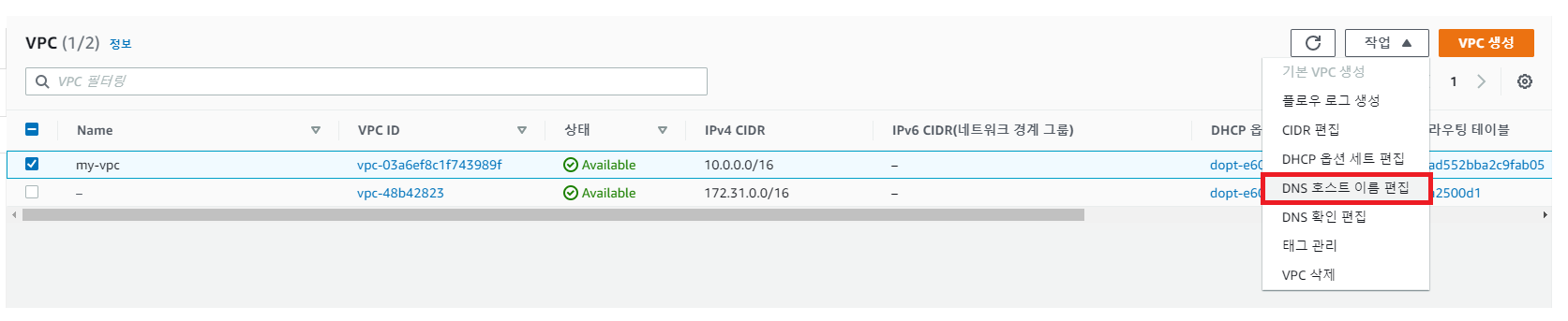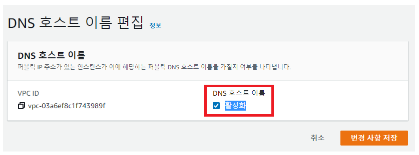 - "DNS 호스트 이름 편집" 이란 옵션을 통해 VPC 내 속한 리소스들이 DNS Name을 가지도록 설정한다.