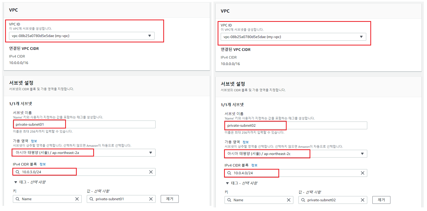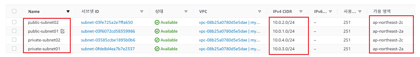 - 프라이빗도 동일하게 다른 가용영역에 한개씩 구성해준다.