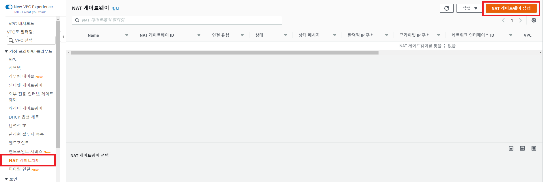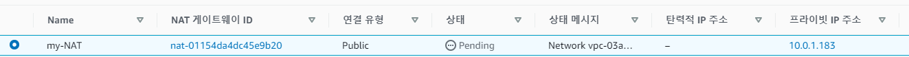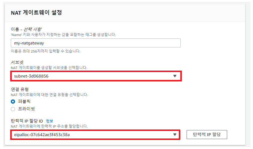- NAT Gateway는 프라이빗 서브넷을 대신하여 외부와 통신하는 공인 IP이기 때문에 Elastic IP를 할당해준다.