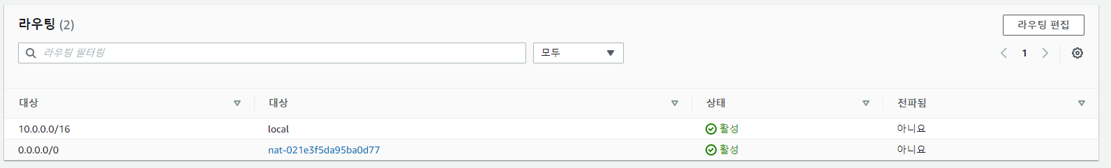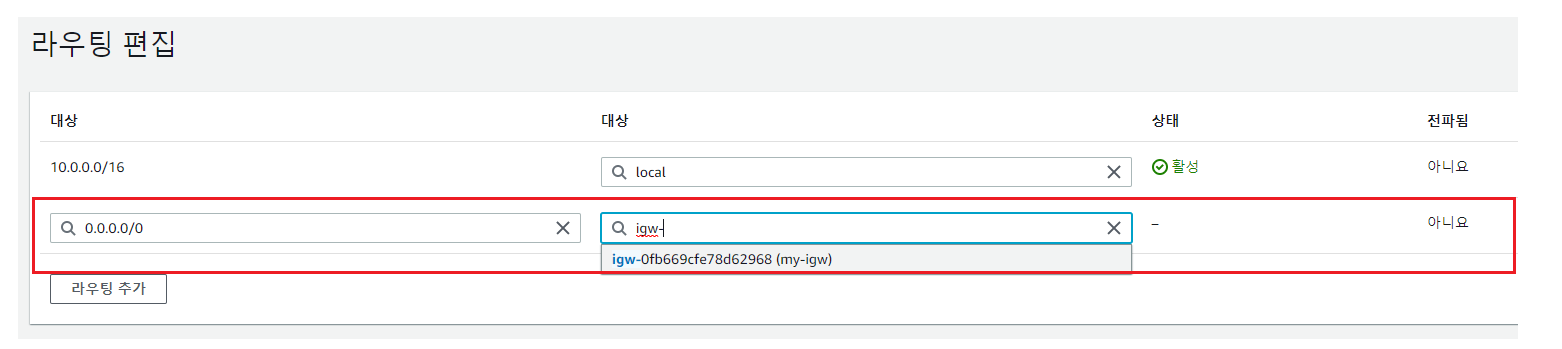 - [라우팅 편집]을 통해 0.0.0.0/0, 즉 모든 ip와의 통신은 igw를 거쳐 나가게 된다.