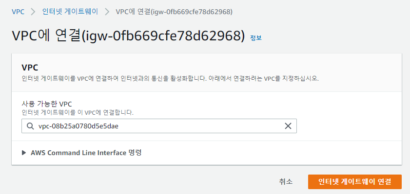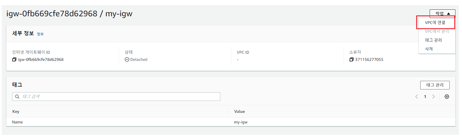 - 생성한 Internet Gateway를 조금 전 만들었던 VPC와 연결한다.