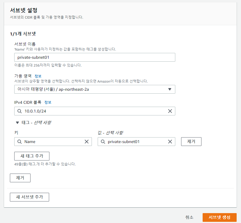- 아래와 같이 private subnet을 생성해준다.