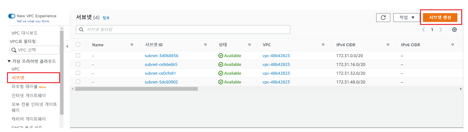 - default VPC에 속한 서브넷 외에 새로운 서브넷을 생성하기 위해 [서브넷 생성]을 클릭한다.