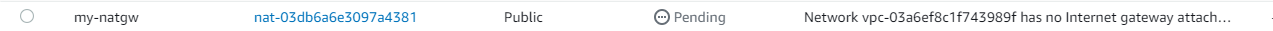 - 인터넷 게이트웨이가 할당되지 않은 서브넷에 NAT GW를 생성 시 아래와 같은 오류 메시지가 표시되며 failed가 뜬다.