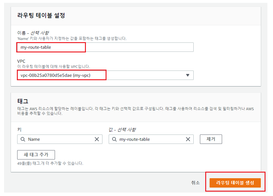 - 이름과 사용할 VPC를 설정하고 [라우팅 테이블 생성]을 클릭한다.