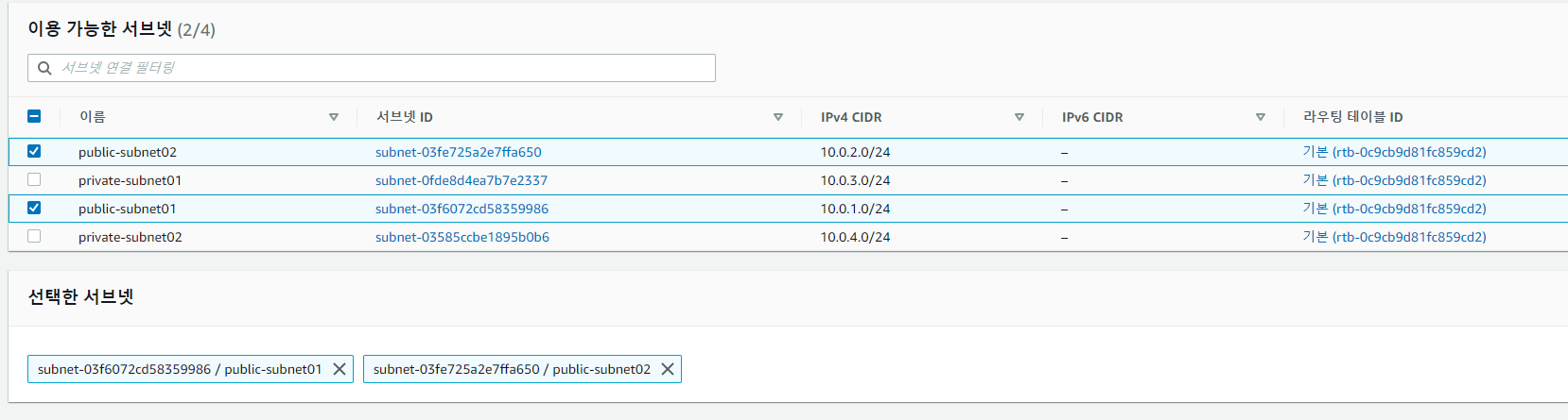- public subnet 두 개를 선택해준다. (public subnet은 외부와 통신이 이루어져야 하기 때문에)