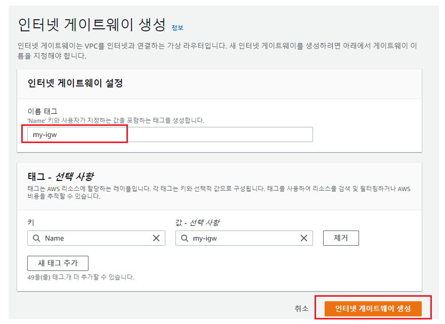 - vpc의 이름을 설정하고 [인터넷 게이트웨이 생성]을 클릭한다.